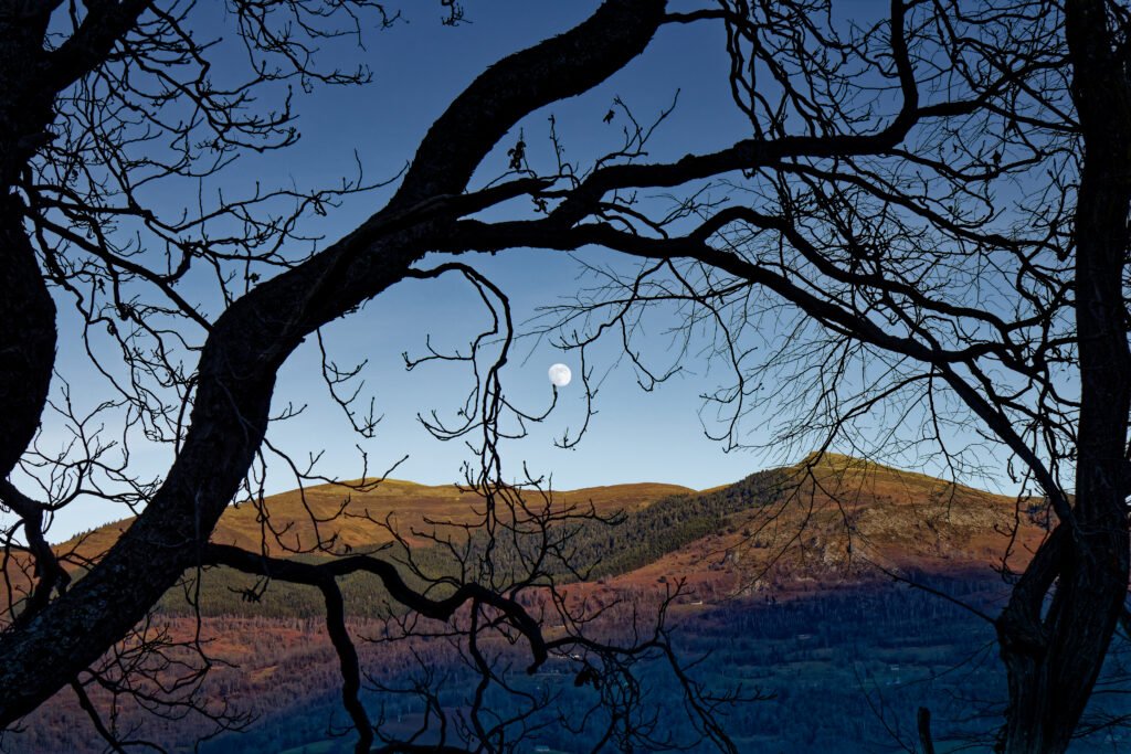 Une fenêtre naturelle encadre la lumière dorée des montagnes, illuminées par les derniers rayons du jour. Au-dessus, la lune veille silencieusement, offrant une vision poétique entre ombre et lumière.