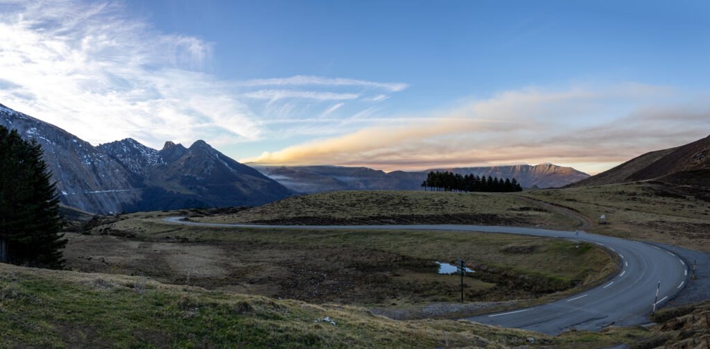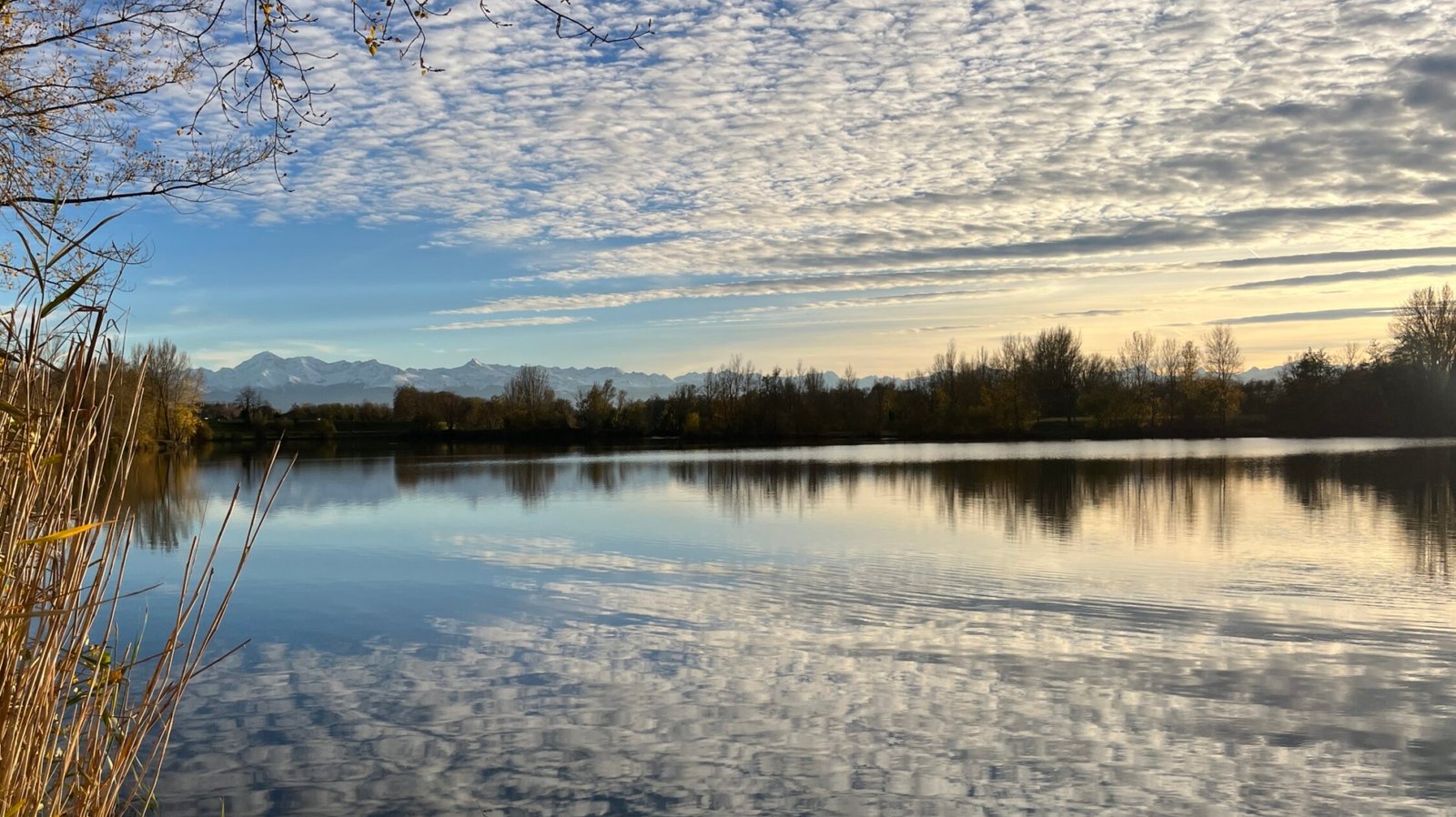 Un lac calme reflète un ciel habillé de nuages délicats, tandis que Les Pyrénées se dessinent à l’horizon, créant une harmonie entre ciel et terre. Une invitation à la sérénité et à la contemplation.