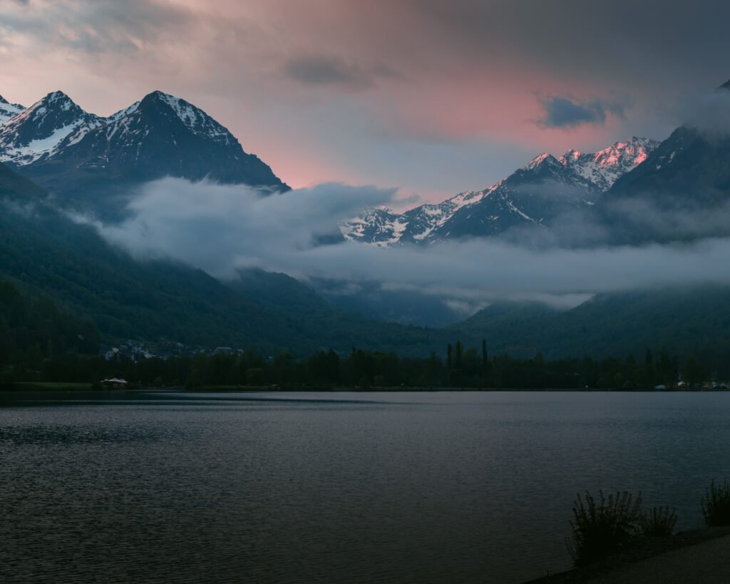 Les sommets enneigés se parent d’une lueur rosée tandis que la brume danse au-dessus du lac. Un instant suspendu où la nature dévoile toute sa majesté et sa sérénité.